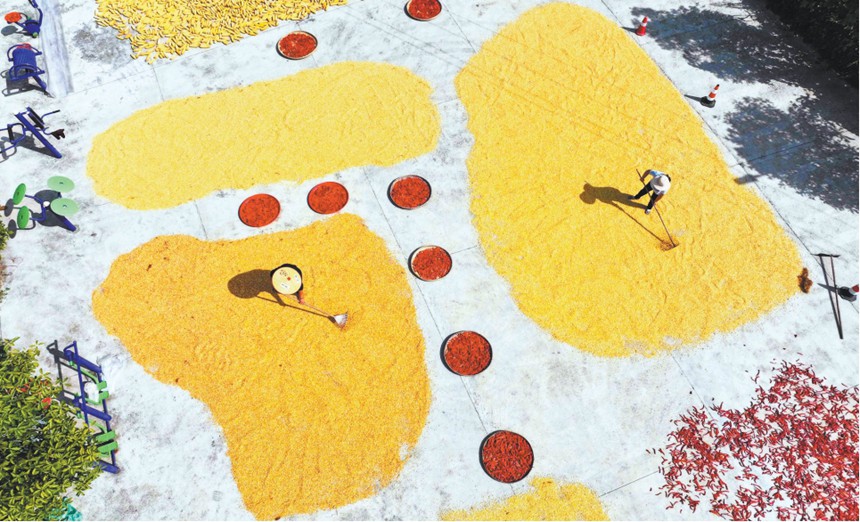 7月29日,梁平區雙桂街道黃泥村,村民在院壩晾曬豐收的玉米和辣椒。 盛夏時節,梁平區各地農民抓住晴好天氣晾曬收獲的玉米、辣椒等農作物,鄉村房前屋后、田間地頭隨處可見多彩的豐收圖景?!?/p>