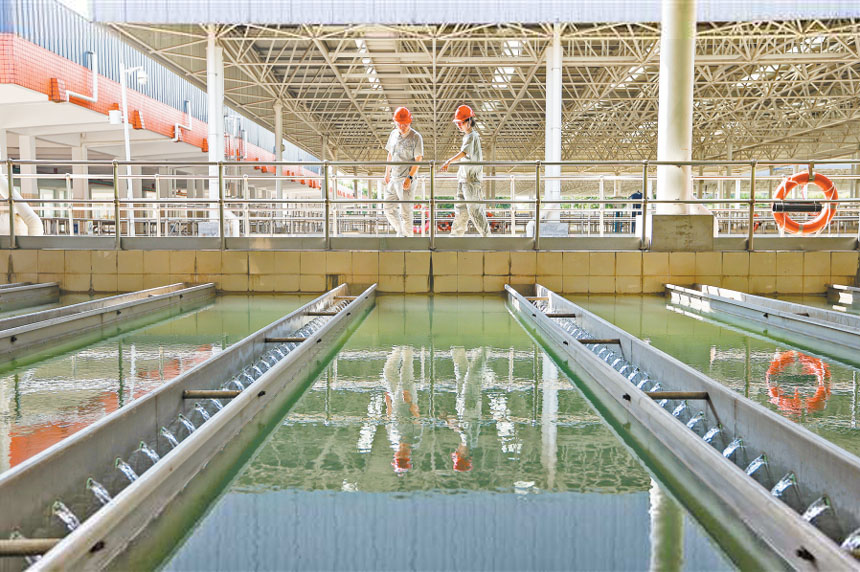 8月4日,大渡口豐收壩水廠,工作人員正在高溫下巡查。 連日來,重慶持續高溫,多地氣溫超40℃,市民用水量激增?!?/p>