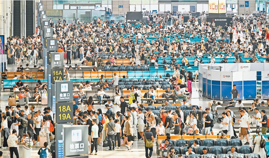 8月4日,重慶火車北站,旅客在候車廳候車。 暑運過半,截至8月3日,重慶火車站共計發送旅客832.2萬人次,日均發送旅客24.5萬人次?!?/p>