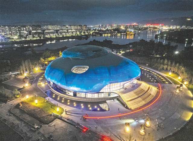 9月22日,夜幕下的梁平區都梁大劇院燈光璀璨,宛如雙桂湖畔的一顆明珠,吸引眾多市民游客前來觀賞。 日前,都梁大劇院正式完工?!?/p>