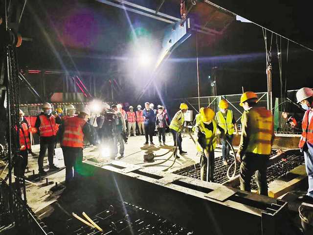 5月1日凌晨,施工人員奮戰在大橋連續梁合龍施工現場。(中鐵十五局重慶鐵路樞紐東環線項目部供圖)