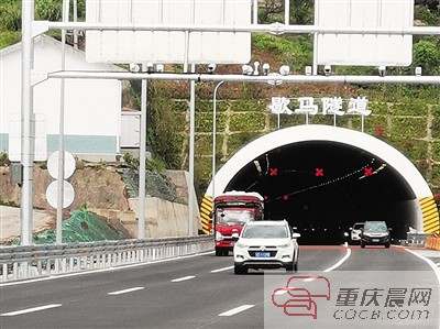 陳衛從北碚新城經碚青路到歇馬,左轉進入歇馬隧道延伸線,雙向六車道的路面上,一路暢通,不久便進入剛剛通車的歇馬隧道,隧道內也是雙向六車道。5分鐘的時間,陳衛就從入口到達了歇馬隧道東端的出口。陳衛告訴記者,平時早晚高峰期,渝武高速北碚隧道交通比較擁堵,今天從歇馬隧道走,比平時節約了近15分鐘!暗枰⒁獾氖,隧道內全是實線,是不能隨意變道的。而且隧道內限速,洞口兩端都有攝像頭,時速不得超過80公里!