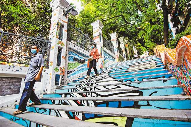 5月9日,渝中區棗子嵐埡街道,市民行走在時光里·棗子嵐埡步道上。位于人民大禮堂北部的時光里·棗子嵐埡步道,連接著棗子嵐埡正街與中山二路。步道階梯由亮色瓷磚裝點,階梯的立面上涂繪了渝中區的熱門景點,步道旁修建了“文化墻”。美麗的步道增添了山城的顏值,提高了市民的生活品質。