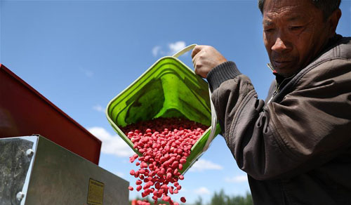5月12日,臺安縣洪家農牧場的一名工人往農機里投放花生種子。 隨著氣溫升高及土壤墑情適宜,遼寧省鞍山市臺安縣搶抓農時開始大面積播種花生,田間地頭一派繁忙景象。 新華社記者 姚劍鋒 攝