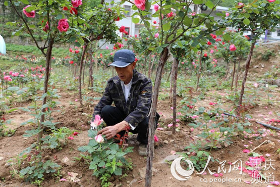 “我們種植品種主要有大花月季、小青桿月季和切花玫瑰,這三種花花朵大,花色豐富,花香濃!苯鹬揖w說,園區的花株都是河南引進的枝條嫁接本地的山木香培育而成,適應新坪村海拔高溫差大的氣候,且花期長,采摘越勤,出花量越多。