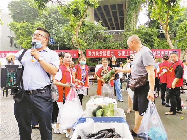 “農家土貨來趕集,請為扶貧出把力!敝抑萁值厘\鴻社區的“愛心集市”設在長江大橋下。來自石寶鎮太平村的黨支部書記袁亮身挎音響、手拿話筒,正賣力吆喝:“買茄子南瓜嘍!貧困村貨真價實的農產品!”