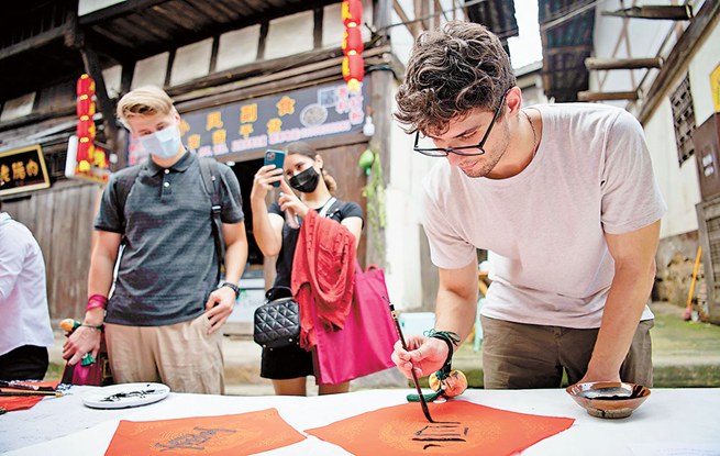6月24日,巴南區豐盛古鎮,外國友人正在體驗書法。記者 謝智強 攝/視覺重慶