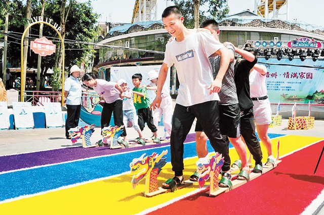 6月25日,涪陵區美心紅酒小鎮景區,游客參加木板鞋龍舟趣味賽。通訊員 何乾健 攝/視覺重慶
