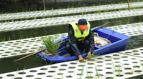 6月29日,工作人員在吳興區湖東街道的“水上稻田”插秧。 今年以來,浙江湖州吳興區湖東街道開始在轄區河道大規模推廣“水上稻田”新型農業項目,利用浮島進行特種水稻種植,既能凈化水體,又能產出生態稻谷!八系咎铩鳖A計在11月實現收割。 新華社記者 翁忻旸 攝