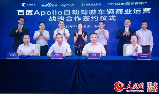 人民網重慶7月13日電(陳琦、劉敏)今日,記者從渝中區獲悉,百度Apollo自動駕駛車輛商業運營戰略合作簽約儀式近日在渝中區舉行。重慶百潤信息技術有限公司、百度智行信息科技(重慶)有限公司、中國農業銀行股份有限公司重慶市分行、浙商銀行股份有限公司重慶分行達成戰略合作,加速百度Apollo自動駕駛車輛在重慶各大景區、產業園、高校、機場等應用場景的商業化落地。