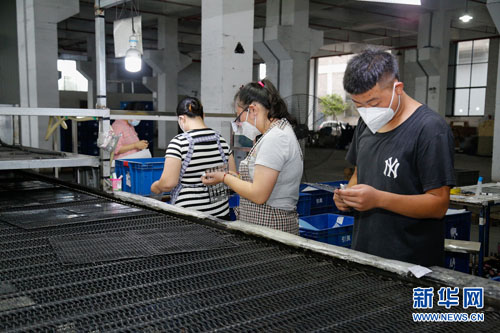 重慶引夙電子有限公司的員工在生產線上進行加工作業。新華網 耿駿宇 攝