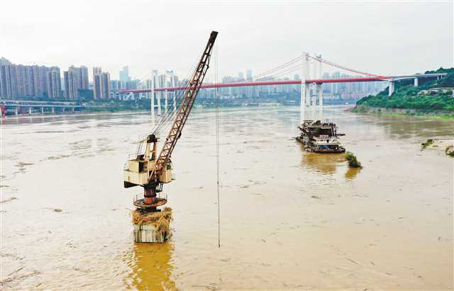 8月13日17點,長江南岸啞巴洞碼頭漲水明顯,施工塔吊主體底座已經淹沒。特約攝影 郭旭/視覺重慶