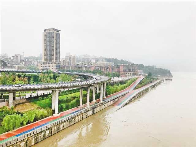 8月13日9時,嘉陵江上漲的江水已經將正碼頭廣場步道部分淹沒。通訊員 劉洪滔 攝/視覺重慶