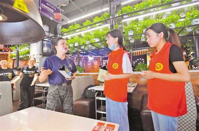 八月十五日,渝中區龍湖時代天街,志愿者們向商家宣傳文明就餐理念。記者 鄭宇 攝\視覺重慶