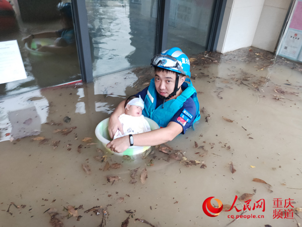 人民網重慶8月19日電(陳琦、黃軍)近日,洪峰過境重慶。8月18日下午,重慶藍天救援隊隊員藍林接到重慶市合川區龍湖美岸小區求助電話,救援隊員到達后,發現小區一樓大門到樓層樓梯處已進水,要進去必須潛到水下去。藍林進去后與求助者匯合,考慮到有嬰兒,他把嬰兒放進臉盆里,一點點移動,成功把嬰兒救了出來。
