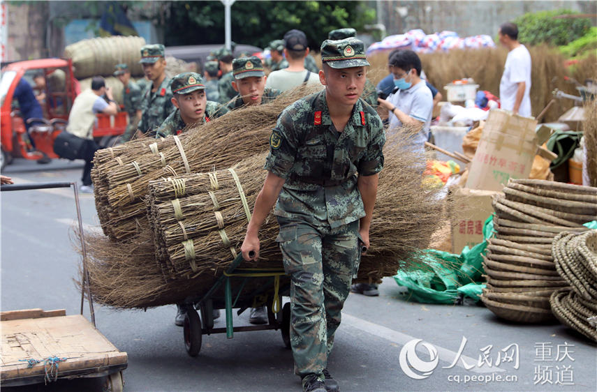 8月18日,武警官兵在重慶巴南區魚洞街道幫助群眾搶運物資。郭傳伍攝