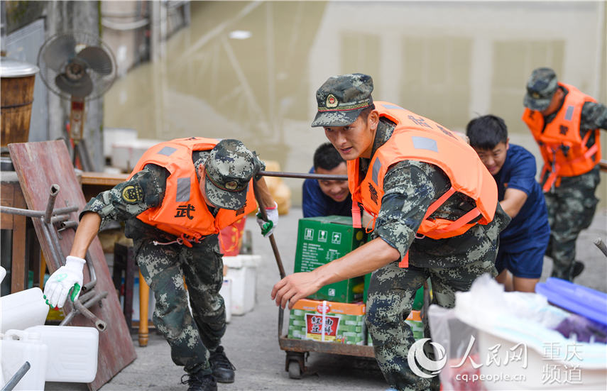 8月18日,在重慶北碚區水土街道,武警重慶總隊機動支隊官兵在幫助群眾搶運物資。王肸攝