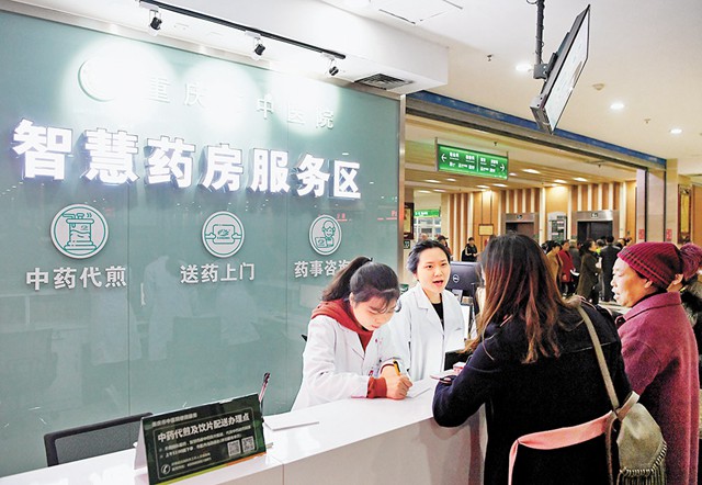 市民在重慶市中醫院“智慧藥房”辦理代煎中藥和送藥到家服務(2018年11月9日攝)。 新華社記者 王全超 攝