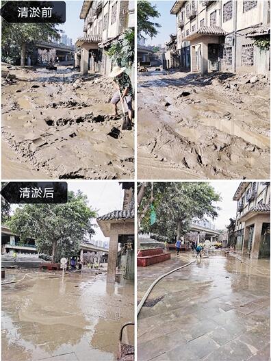 經過三天的大面積清淤,目前磁器口古鎮80%的受淹區域,已完成了清淤工作,也就是說,在環衛工人、城管隊員和志愿者們的齊心協力下,已有8萬余平方米的淹沒區露出了昔日潔凈的面容。
