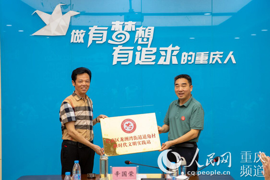 巴南區委書記辛國榮(右)為道角村新時代文明實踐站授牌。何洲行攝