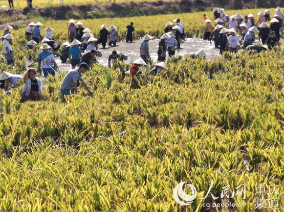 人民網重慶8月29日電 “一分耕耘才有一分收獲呀!”“快點,我腳下踩到一條魚了!”秋后10天滿田黃,巴南區木洞鎮立秋后的山水之間,一片片稻田已經逐漸成熟,稻穗顆粒飽滿。29日,在一曲極具特色的“慶豐收”木洞山歌聲中,“慶豐收 迎小康”木洞鎮第三屆農民豐收節,在海眼村劉家沖正式開幕,市民們一起體驗割稻比賽、稻田摸魚樂趣。同時,現場對木洞鎮3位脫貧光榮戶、12位脫貧致富帶頭人和3家優秀農業龍頭企業予以表彰獎勵。