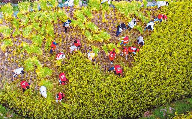 秋收時節,層層梯田,金色的稻浪隨風搖曳。8月28日,綦江區扶歡鎮插旗村,重慶日報、綦江區融媒體中心、綦江團區委的近百名黨員志愿者走進田間地頭揮動鐮刀,幫助當地貧困村民收割稻谷,田間一派忙碌的景象。石亮 攝/視覺重慶