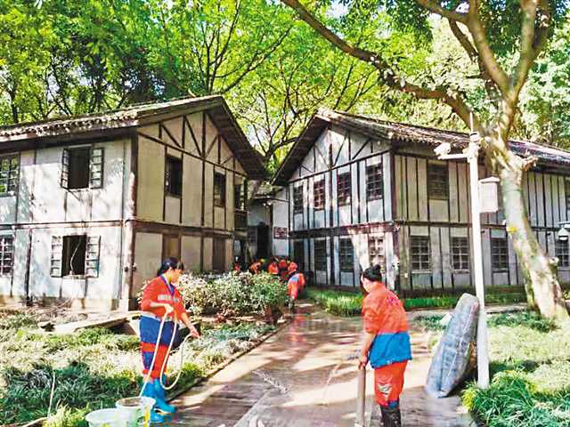 紅巖聯線管理中心組織人員對《新華日報》總館舊址進行清淤。(紅巖聯線管理中心供圖)