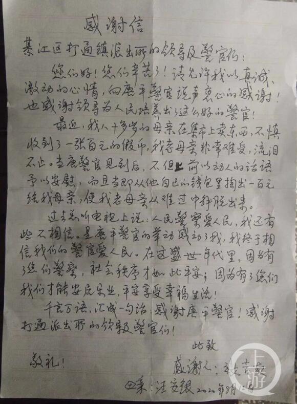 張先生看到母親回家后情緒有了變化,一打聽知道了民警做的好事,隨即寫來了感謝信。信中除了對唐頻表達感謝,還寫道:“在這盛世年代里,因為有了你們警察,社會秩序才如此平安;因為有了你們,我們才能安居樂業,平安享受幸福生活!”