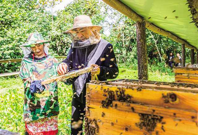 金秋時節,南川山王坪鎮廟壩村迎來了蜂蜜收獲季。村民鄭小林在山林里的蜜蜂園內,打開一個個蜂箱,收獲著香甜的蜂蜜。甘昊旻 攝