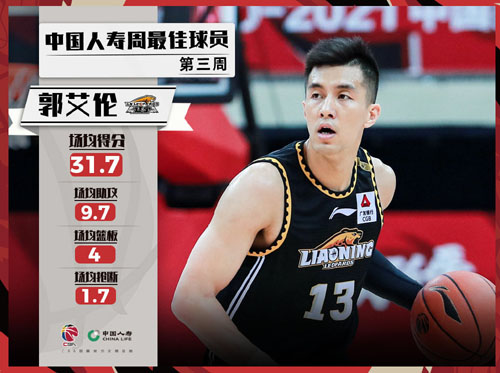 遼寧男籃球員郭艾倫在上周的三場比賽中,場均上場36.5分鐘,可以貢獻31.7分、9.7次助攻、4個籃板和1.7次搶斷,真實命中率為60.9%。在他的帶領下,遼寧隊在上周取得了兩勝一負的戰績。