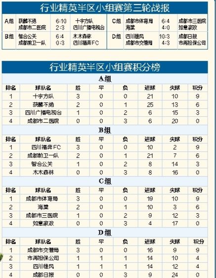 經過5個半小時的鏖戰,由成都市體育局、成都日報社主辦,貝塔科技(蘇州)有限公司、農夫山泉股份有限公司特別支持的“愛成都·迎大運”2020“黨報讀者杯”足球賽(五人制)昨日在青羊區FF體育公園結束了行業精英半區小組賽第三輪的比賽。隨著海棠和市再擔保公司的晉級,該半區晉級十六強的8支球隊全部出爐,他們分別是——