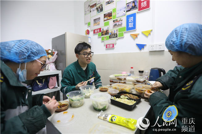 劉才剛和同事們忙到晚上才一起吃盒飯。院方供圖