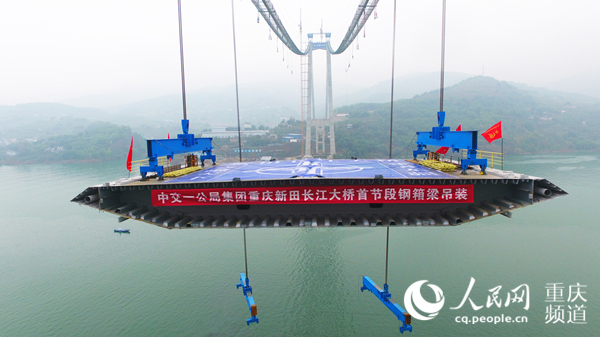 人民網重慶1月4日電 1月3日,在大型吊裝設備——跨纜吊機的牽引下,重慶萬州新田長江大橋首節段鋼箱梁緩緩提升,在江面上順利完成和吊索的匹配連接,這標志著由中交一公局集團建設的新田長江大橋正式進入千米級橋面施工階段。