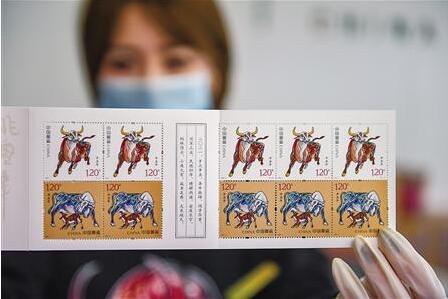 當日,中國郵政發行《辛丑年》特種郵票1套2枚,圖案分別為“奮發圖強”“牛年大吉”。 新華社圖