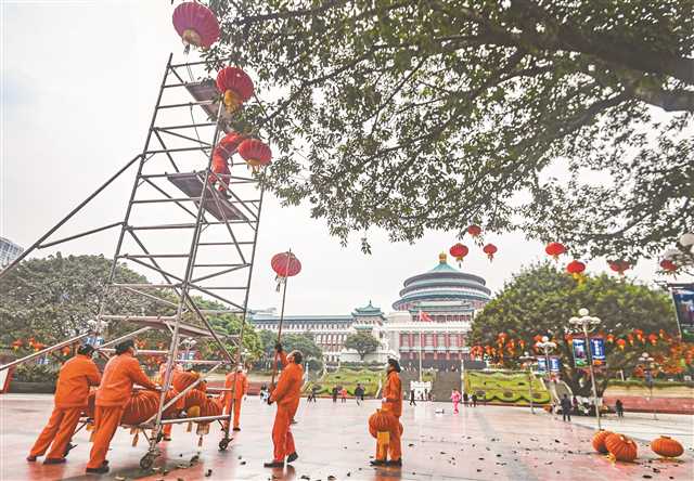 1月6日,重慶市人民大禮堂,工人正在將燈籠掛在樹梢上。隨著春節的臨近,城區各地開始張掛喜慶的燈飾,節日的氛圍越來越濃厚。