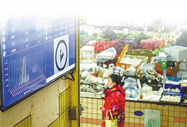 1月7日,渝中區大田灣菜市場,屏幕上顯示豬肉采購地等信息。記者 龍帆 實習生 何佩玙 攝/視覺重慶