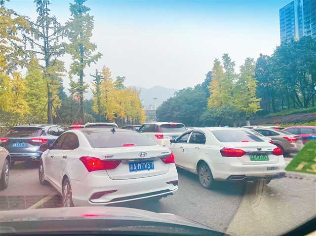 早上7點半,記者駕車從萬象城出發,進入海峽路定向車道起點時為7點48分。此時,該定向車道已經排起了長隊。