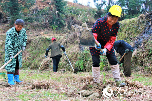 村民正在忙著栽種油茶。 彭媛攝