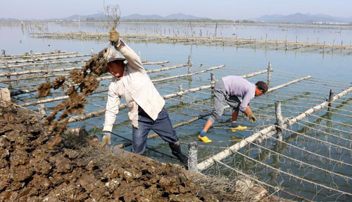 1月13日,廣東陽西縣程村鎮紅光村村民在收蠔。