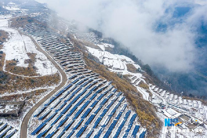 新華網消息,1月17日,重慶市黔江區普降小雪,海拔1500多米的麒麟蓋一塊塊光伏發電板被白雪覆蓋,呈現出別樣雪景。