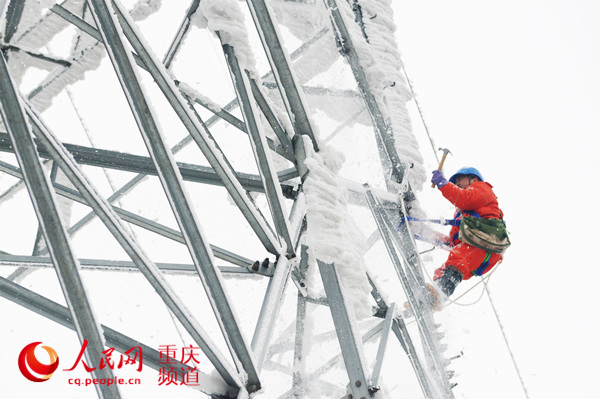國網重慶巫溪供電公司員工在110千伏河白西線17號鐵塔上除冰。 李實鮮攝
