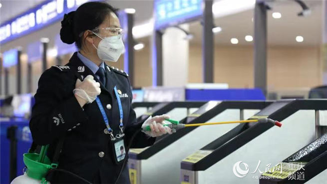 圖為重慶邊檢民警在航班前后對邊檢通道進行消毒。重慶出入境邊防檢查總站供圖