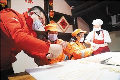除了劉淑霞,活動還邀請了8名留渝過年的外地人員代表在磁器口陳昌銀麻花體驗館現學做麻花。他們當中既有上游新聞、重慶晨報最近報道的《致敬每一個不回家過年的你》的部分主人公,也有醫護人員、快遞小哥、建設工人、社區工作人員。