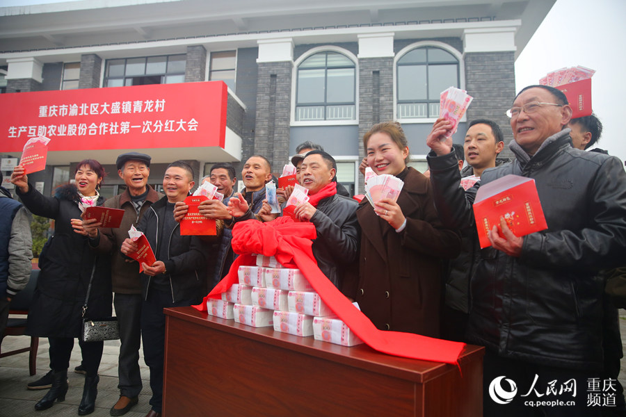 2月9日,重慶市渝北區大盛鎮青龍村張燈結彩、喜氣洋洋——不光因為春節即將來臨,更是因為青龍村生產互助農業股份合作社舉行第一次分紅大會。合作社“股東”依次上臺領取分紅,一手拿著股權證,一手拿著大疊現金,每個人臉上都樂開了花。