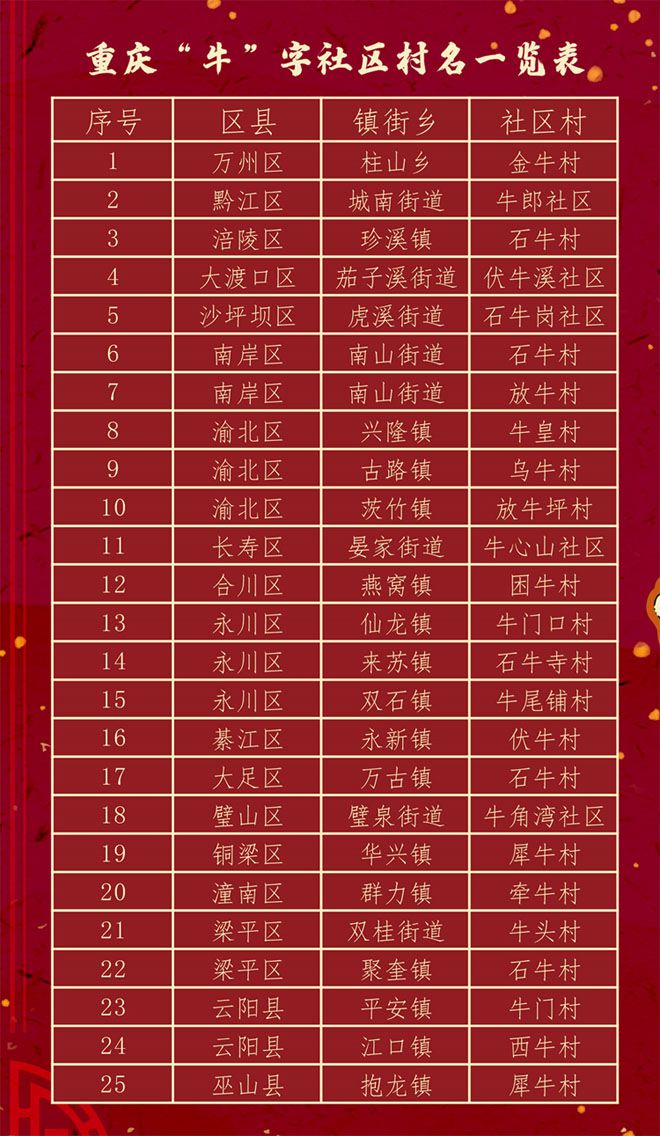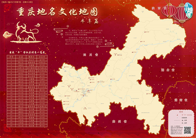 2月8日,重慶市規劃和自然資源局、重慶市地理信息和遙感應用中心,根據全市帶“!钡纳鐓^村地名,推出了《重慶地名文化地圖之牛年篇》,一起來看看。