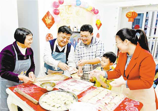 二月七日,合川區草街街道重慶蘊豐建設工程有限責任公司員工宿舍,公司負責人與留渝過年的員工一起包水餃。特約攝影 楊波\視覺重慶