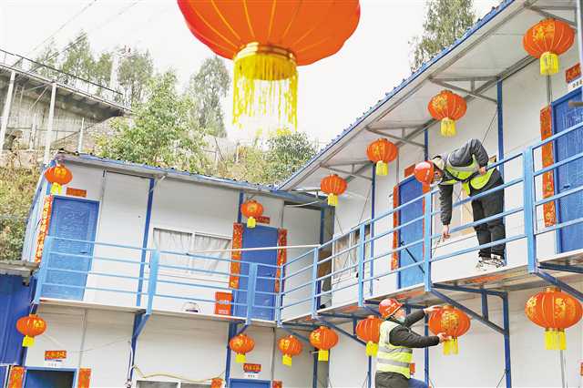 二月八日,在黔江區過境高速公路工業園隧道口工地,就地過年的工人在給宿舍掛燈籠。特約攝影 楊敏\視覺重慶