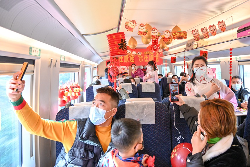 2月9日,C6409次列車上乘車旅客與演員合影。包亮攝