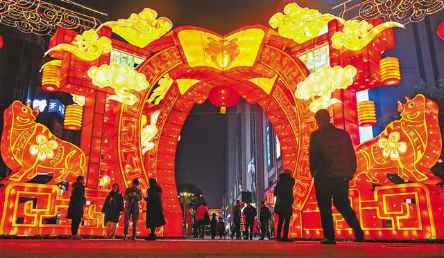 2月16日,北碚區嘉陵風情步行街,市民們從燈飾拱門下走過。記者 萬難 攝/視覺重慶