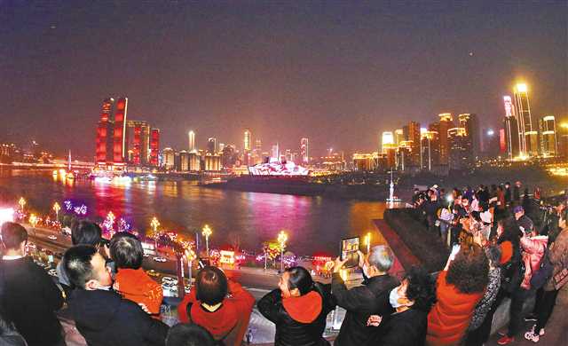 2月14日晚,南岸區彈子石,游客們正觀賞兩江四岸夜景。特約攝影 鐘志兵/視覺重慶